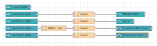 A second step in the finalization of the main component is importing the panels from Grafana into a single dashboard in Node-RED (see Figure 3). To achieve this embedding, the grouping system in the layout tab from Node-RED is used. Every panel was given a tab and positioned in the desiderated location on the interface. The panels are embedded by using a function node. In this node, the payload is represented by the IP address on which the Grafana server runs, the port 3000, a link obtained from individual panels, the refresh time, theme, from and to date which belong to the predefined variable called msg, and the ID of the panel.