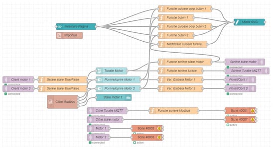 Thereby, regarding a cost-benefit balance, it would be difficult to identify shortcomings related to classic SCADA systems. Regarding the multiple connectivity options to devices and services, the modern modular approach and scripting, as well as the possibilities of data analyzing and manipulation, are providing many more options than other SCADA systems. Moreover, in the authors’ opinion, Node-RED represents the environment with one of the highest potentials for IoT/IIoT, and follows the proposed conceptual approach with a high rate increase for SCADA solutions. Basically, the entire SCADA project will be exposed through flows that can be exported as .json files. The flow-based guiding concept offers a high technological readiness level (TRL) and allows the easy identification of tags, objects, data vehiculation, etc. Therefore, it can be rapidly accepted by SCADA integrators.