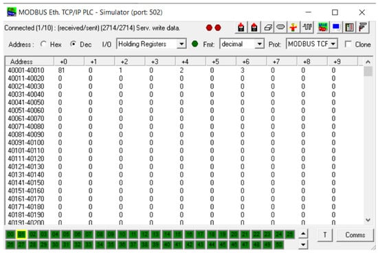 Using the logic described above, a Modbus TCP/IP protocol simulator was used to recreate the required environment for further development of the IoT network. Any application that can simulate the necessary configuration of the Modbus TCP/IP protocol will achieve the imposed requirements. Therefore, it was chosen to continue the implementation using Mod_RSsim, which can successfully accomplish all conditions. The Modbus simulator was used because of the current worldwide issues that did not allow the authors to test and validate the developments until the last moment. However, the developments were also validated in laboratory using Siemens stands based on S7-1214C PLC where a Modbus TCP server was implemented, Scalance switches, Teltonika 4G routers, Siemens motors, frequency converters, encoders, etc.