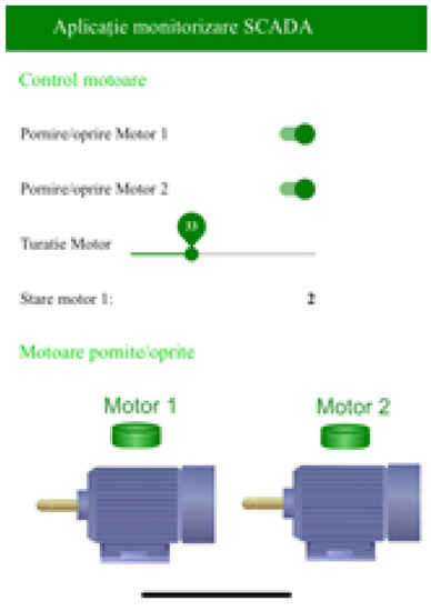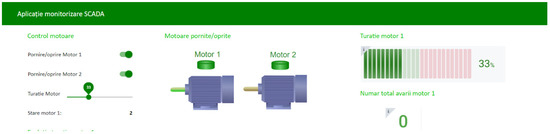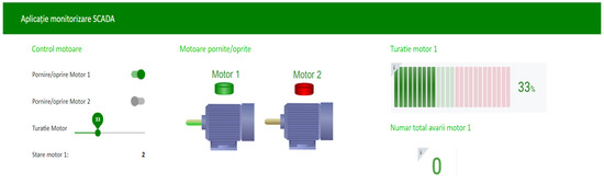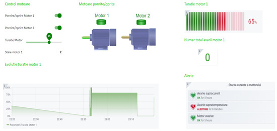 As enacted in Figure 5, it is observable that the running motor is motor 1, its revving is set to 81%, all of these being updated in real-time on the SVG model, alongside the imported panels. The real-time nature of the application allows for a precise monitoring of the information that circulates through the network.
