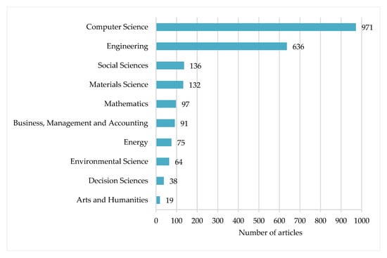 The two subject areas that accumulate the most published documents are computer science (971 articles, 75.98%) and engineering (636, 49.77%). These are followed by social sciences (136, 10.64%), materials science (132, 10.33%), mathematics (97, 7.59%), business, administration and accounting (118, 7.12%), energy (75, 5.87%), environmental sciences (64, 5.01%), decision science (38, 2.97%), and arts and humanities (19, 1.49%). It is necessary to clarify that the same article can be classified in more than one subject area depending on the criteria of the editor; therefore, the sum of the articles classified in all areas, consequently, add up to more than the total sample (1278).