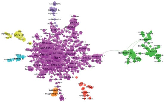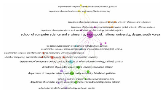 Finally, cluster seven (orange) groups, among others, the Department of Computer Software Engineering, National University of Sciences and Technology (Pakistan); the Department of Information Communications Engineering, Hankuk University of Foreign Studies (South Korea); and the Department of Computer Science, Sarhad University of Information Science and Technology (Pakistan).