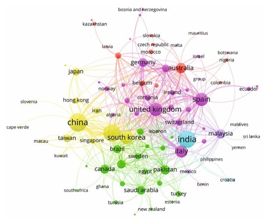 Cluster 5 (violet) groups 5.75% of all countries/territories and is headed by Malaysia. This country/territory collaborates with Yemen, Mexico, Sri Lanka, and Maldives. Finally, cluster 6 (blue) is led by India and groups 4.60% of all countries/territories. This country/territory collaborates, among others, with Chile, Croatia, and the Philippines.