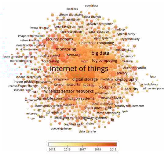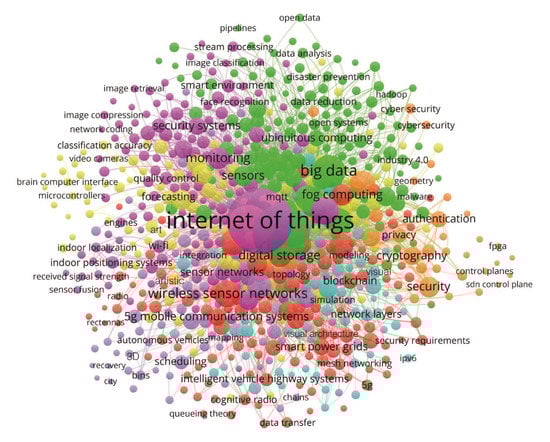 Cluster 1 (pink) is headed by “Internet of Things”, and groups 20.52% of the keywords. This is associated, among others, with network security, monitoring, sensor nodes, deep learning, security systems, middleware, IoT applications, sensor networks, neural networks, deep neural networks, virtual reality, information services, wireless networks, image processing, telecommunication services, Wi-Fi, digital devices, quality control, mobile computing, global positioning system, sensor data fusion, data fusion, data integration, energy efficient, network infrastructure, robots, testing, cooperative communication, mobile communication networks, multi-media communications, multicasting, device-to-device communications, received signal strength (RSS), indoor environment, surveillance video, network coding and image quality.