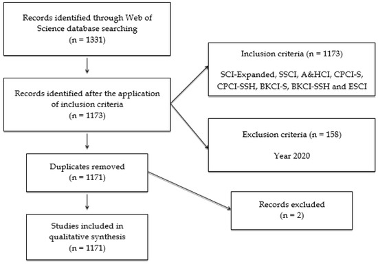 This study has followed several phases. First, the database was determined. In this case, WoS was chosen because it is a database where relevant literature is stored, and it is also the database from which Journal Citation Reports (JCR) feeds in order to establish the most relevant metrics in the field of research. Next, the search of all the scientific literature on ECIT metadata was carried out, using the following search equation: “edge computing” [TITLE] AND “internet of things” [TITTLE]. This search initially generated a total of 1331 documents of various kinds. After performing and applying a PRISMA protocol (Figure 1), a total of 1171 remained. These documents are the ones with which the present study was finally carried out. As criteria for inclusion, all the existing scientific production in WoS has been taken into account, except for the scientific production of the year 2020. As an exclusion criterion, in addition to the year 2020, we added the literature that appears in the WoS.