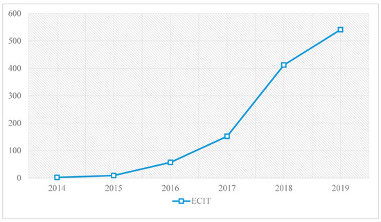 The scientific evolution of the 1171 documents on the ECIT theme shows a dizzying evolution in recent years. It is of recent creation, given that its beginnings in WoS date back to 2014. From that date until 2016, production maintains a moderate rise, but from 2017 to 2019, production shoots up. This shows a great impact on the scientific community of ECIT studies (Figure 2).
