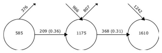 The evolution of keywords, which is represented in Figure 3, shows information about the keywords that enter and leave in the previously established periods. In addition, it shows the level of coincidence of keywords between periods. In this case, it is shown that between the first and second period, the level of keyword matching is 36%, while between the second and third period it is 31%. Although the percentages of coincidence are high, there is a downward trend. This is because the ECIT study is establishing new lines of research.