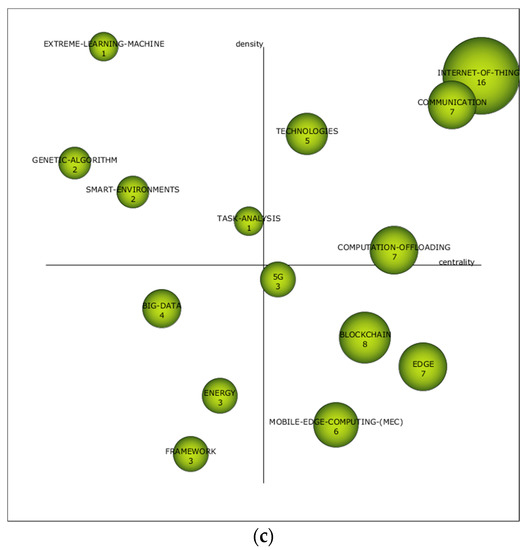 In the third period (2019), the driving themes are “internet-of-things”, which is related to “fog-computing”, “security”, “things”, “cloud”, “edge-computing”, “resource-allocation”, “internet” and “cloud-computing”; “communication”, which relates to “wireless-energy-transfer”, “maximization”, “trajectory-design”, “networks”, “system”, “power-allocation”, “computation” and “transmission”; “technologies”, which relates to “IIOT”, “smart-factory”, “simulation”. “cyber-physical-system”, “protocol”, “vanet, “fog” and “industry 4.0”; and “computation-offloading”, which relates to “game-theory”, “execution”, “stochastic-optimization”, “mobile-edge-computing”, “application-partitioning”, “optimization”, “management” and “radio”. In other words, it follows the same trend as in previous periods, although the scientific community is beginning to open up the field of research to other topics directly related to connection networks and transmission media. Furthermore, in this period, the “big-data”, “energy” and “framework” themes must be taken into account. These themes are considered as unknowns, due to their location in the diagram. This indicates to us that they can be the driving themes on the ECIT theme in the coming years.
