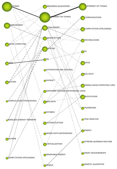 In the second period (2018), the driving theme is “internet-of-things”, which is related to “fog-computing”, “security”, “things”, “cloud”, “edge-computing”, “internet”, “blockchain” and “cloud-computing”. In this case, it follows the trend of the first period, continuing to focus research on the use of the internet for information storage and security.