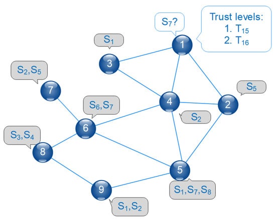 Trust is the critical factor in almost every aspect of the IoT and in network applications. Figure 2 provides a simple example of a generic network, with each node capable of providing one or more services, as highlighted in the grey clouds; Node 1 is the node that is requesting the service , as highlighted in the white cloud; in this example, we consider that Nodes 5 and 6 can provide the requested service, and then, they represent the providers. For each of the possible providers, the requester computes the trustworthiness level ( and ) and then chooses the provider with the highest value, which is number 5 in our example. Therefore, the goal of the paper is to provide the guidelines to design a trust management model in order to provide suitable services to the IoT nodes, discarding all the malicious behaviours.