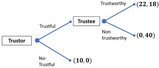 In the IoT, both the requester and the provider face a binary choice, not a continuous one: the trustor has the binary choice to trust the trustee or not, and in case the trustor decides to trust, the trustee faces a binary choice to either honour it or abuse the demonstrated trust. The binary trust game was formalized in []. Figure 3 illustrates the original game proposed in the state-of-the-art []. We add a brief description of it for the sake of clarity, but we refer to the cited paper for a more detailed description. In the game, a player, the trustor, is endowed with an amount of €10, and it has to decide to keep the whole amount for itself or to transfer the sum to a second player, the trustee. In the first case, the game ends with an amount of €0 for the second player, so the trustee is not trustful. Otherwise, if the trustor provides the sum to the trustee, the €10 is quadrupled, and consequently, the trustee receives €40. Now, it has to decide between two behaviours: it can be a trustworthy player giving €22 to the first player while keeping €18 for itself or it can act maliciously by keeping €40 for itself and leaving the trustor with an amount of €0.