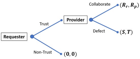 For these reasons, we consider an iterated trust game with an unknown number of transactions, where the complete payoff is determined according to the strategy adopted in each game. The incentive to behave maliciously in the short term is compensated by the possibility for the requester to punish the provider after the abuse of trust. For cooperation to emerge between rational game players, the total number of rounds must be unknown to the players. In this case, “always defect” may no longer be a strictly dominant strategy, but it remains a suboptimal Nash equilibrium. Based on the previous considerations about the cost and benefit for the two players, the payoffs are determined as follows: