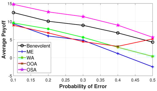 Average payoffs for different probabilities of error for the cooperative nodes.