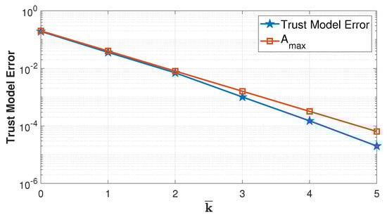 Furthermore, the importance of the parameter is illustrated in Figure 7. At the end of the simulation, i.e., after 100 transactions, the figure shows how the worst error is when since the cooperative nodes are all discarded and no errors are allowed. The minimum value that allows a maximum admissible error equal to 0.001 is : this value allows cooperative nodes to avoid being discarded due to errors and, at the same time, enables the trust model to quickly identify the attacks.