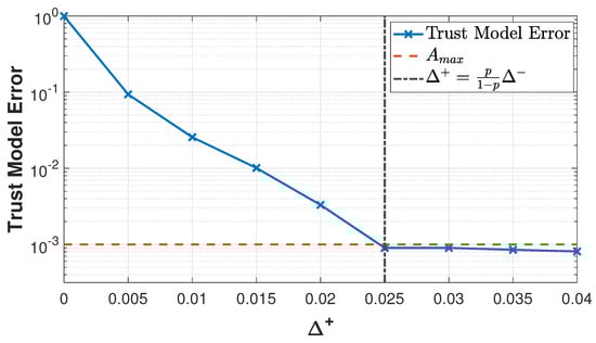 Figure 6 shows the trust model error in discarding cooperative nodes, considering a scenario with cooperative nodes and a probability of error equal to . The orange line shows the computed value for the maximum admissible error as referenced. The Figure shows how the value of is essential to overcome the probability of error of the cooperative nodes and obtain an acceptable error of the trust algorithms. By increasing the value of , the model can decrease the number of discarded cooperative nodes, i.e., the trust model error, at the cost of increasing the vulnerability to attacks.