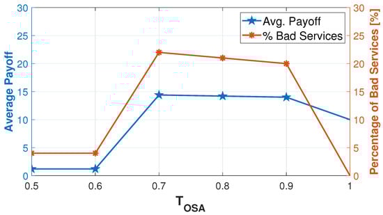 Finally, the behaviour of the OSA node is described in Figure 9. The model threshold is set according to Equation (24) with a value near , because . The figure shows how the best value for is equal to , where the node can perform the highest number of bad services, and thus, its average payoff is maximum. We can also note how the percentage of bad services the OSA behaviour is able to deliver is higher than the error probability of a node (): this is due to the ability of the OSA to exploit the tolerance margin due to the maximum admissible error by the algorithm, . With , the node is immediately detected, and its payoff is lower; while with , the node does not fully exploit malicious opportunities, and then, it cannot achieve the maximum payoff.
