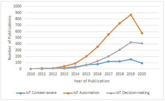 Figure 2 and Figure 3 show the number of publications of IoT in combination with “context-aware systems”, “automation” and “decision-making”. These figures show that the noted topics are respected and considered for research. The number of publications in the respected area is increased year by year. Automation in IoT is increasingly attracting the research community’s interest with a 43% growth in publications on automation in 2018 compared with 2017, and a 60% growth in 2017 compared with 2016. This shows that the topic of automation in the ecosystem is becoming very important and will attract more interests from the research community in the future compared to other research topics such as context-aware systems and decision-making.