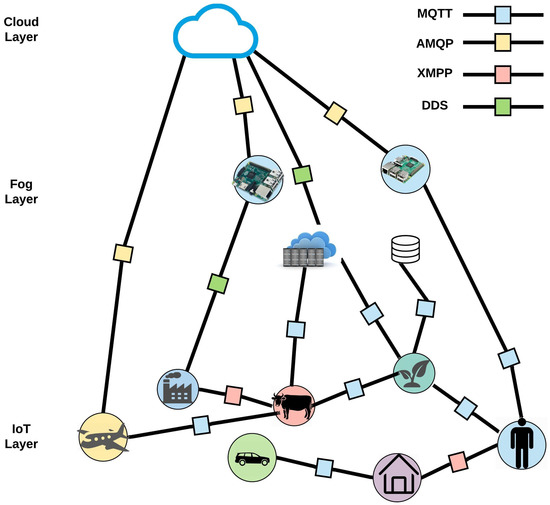 Figure 1 is a schematic diagram of the IoT–Fog–Cloud ecosystem. The ecosystem contains three layers: IoT, Fog, and Cloud, which collaborate for data processing. In the first layer (IoT), different types of objects are connected to the Internet, such as vehicles, humans, houses, and electronic devices. The objects and sensors are connected to the Fog layer, where different types of Fog nodes are available for processing data. The Fog layer is also known as the intelligent layer. Raspberry Pis, Gateways, routers, and smart hubs for homes are examples of Fog nodes. The devices need to connect and communicate for any decision making. Each layer has its characteristics. The first layer (IoT) has cheap resources with local information obtained from IoT sensors with a decentralized architecture. The second layer (the Fog) contains Fog nodes and is responsible for intelligent and real-time actions. The third layer (the Cloud) has global information with sophisticated resources and centralized architecture.