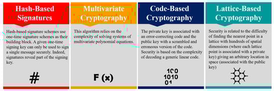 The PQC algorithms, as summarized in Figure 2, are mainly implemented by either Hash-Based Signature Algorithms, Code-Based Cryptography, Multivariate Cryptography Protocols, or by Lattice-Based Cryptography. In the following section, we shall discuss the PQC algorithms briefly.