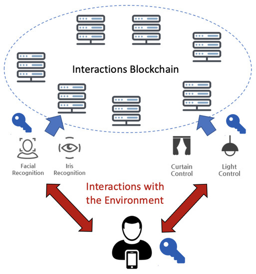 The “Secure Path” makes use of the Blockchain to collect interactions among users and the device in the environment as signed transactions, as shown in Figure 1. Each device has a unique address and, by using its key, is able to digitally sign the information that is published in the blocks. For example, the user can publish their GPS position or information on the wireless networks that they detect. The devices and the systems in the environment can publish their interactions with the user. For instance, if the user is recognised by a biometric system or controls a smart appliance, these interactions can be published either by the user or by the IoT devices and made available to other systems.
