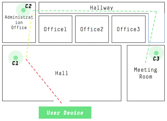 Let us describe the operations in the “Secure Path” using as an example the facility and the path illustrated in Figure 3. We assume that a user that enters the smart space is equipped with a user device (UD). A UD can be a smart-badge or a wearable device, such as a wristband with indoor localisation technology (e.g., Decawaves DW1000 UWB module), RF communication (e.g., Bluetooth, 5G) and, optionally, bio-metric authentication (e.g., vein scanner) for scenarios demanding an extremely high level of security.