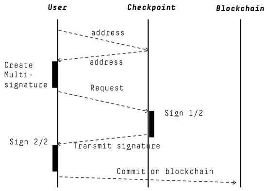 Once the UD is challenged by a checkpoint, a multi-signature transaction flow begins, as described in the flow diagram represented in Figure 4. In particular, the user and the checkpoint need to know their mutual address (hash of their public keys). Then, the user can create a multi-signature address on-demand, involving both identities. After that, the user emits a signature request for the checkpoint (Sign 1/2). According to its internal logic, the checkpoint may agree to fulfil the request, co-sign the transaction, and send the signed message back to the user. Finally, the user completes the transaction with his signature (Sign 2/2). At this point, the user can transmit the transaction to be appended to the Blockchain.