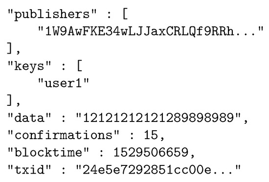 We exploited Multichain data streams to create one stream for each user. Then, we granted read/write access rights to users only for their own streams. A data stream is composed of items where each is represented by a Blockchain transaction. Stream items have a timestamp (taken from the header of the block in which the item is confirmed), payload data, one or more publishers who have digitally signed the item, and an optional key to ease retrieval, which we set as the user ID. An example of a stream item associated with “user1” is reported in Figure 5.