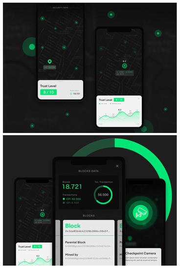 The mobile application was built to emulate the user device. The application was implemented through an Android App, using the GPS as a location source for (outdoor) position information. The application shows user information on a map, takes care of committing the transactions using the web application server, allows interaction with checkpoints to increase the trust level, and shows the user information committed to the Blockchain. Some screens of the application are reported in Figure 6.
