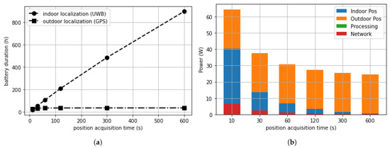 Figure 7a shows the duration of the battery (in hours) when all the previously described hardware is powered by the 850 mAh battery. Clearly, more energy will be required to power all the required circuitry that depends on the specific hardware design (e.g., DCDC converter). However, as we can see from the figure, the energy consumption of the major components is more than enough to allow one charge per week if the position acquisition interval chosen is bigger than 30 s. Figure 7b shows the energy budget breakdown of all the components, varying the position acquisition time. As we can see, the UWB positioning concurs for the greatest part in the energy consumption when frequent indoor location is performed, but its impact can be radically reduced by adopting less frequent position updating, such as one per minute.