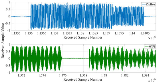 Before the data could be analyzed, it needed to be pre-processed. As shown in Figure 3, the wireless channel is open to any accessible wireless transmitter and spurious interference. It is difficult to receive only a specific type of signal when collecting a data grab during a random time period using an unconnected device (SDR). As a result, most data grabs contained multiple signals of interest along with, potentiality, other “unwanted” signals. The data grabs required processing to obtain the correct signal samples before the feature engineering stage. This processing stage was used to reduce the error/noise in the collected data and to discard clear outliers. Without this data processing stage poor-quality, unrepresentative, noisy, or polluted (with irrelevant features) measurements could be employed in the model development process.
