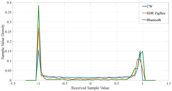 As per Section 3.1, the time series analysis granted access to the required received I/Q samples and the calculation of associated PDFs. In certain circumstances, it was discovered that the ADC can become saturated and, so, the PDFs can become less distinctive (Figure 6). However, it is envisaged that a specific interference detection approach (using different features) [20] can be used to determine if a jamming signal is present. This topic will be discussed further in Section 4.3, where an interference detection use-case using this paper’s features is discussed. Here, wireless devices were non-malicious and, so, the ADC saturation was typical of this operating environment. Here, specific features are developed to identify signals, even when saturation occurs. The automatic gain control (AGC) of the receiver can also affect the produced PDF as two spikes can occur at the limits, since the initial receiver gain changed to a lower value after initial packet reception. However, the calculated PDF is extremely useful in identifying the distinct signals or, at the very least, narrowing the search to a smaller number of possible signals.
