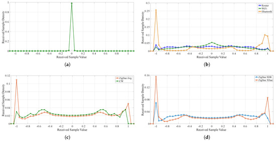 Figure 7a–d present the calculated averaged signal PDFs for the received signal types including noise, WiFi, router (no internet access), Bluetooth Advertising Channels, CW and ZigBee. Distinct features are identifiable in most cases. The exhibited PDFs are the averaged PDFs for each signal across all available data and ZigBee center frequencies [6]. The individual data grabs, as defined in Section 3.1, can contain more than one signal and, so, multiple extractions are permitted, where possible. As the sample length was chosen to be 1250 I/Q samples, which was associated with the received length of the Bluetooth signals, other received signals were also divided into 1250 sample segments. This process meant that the start, middle and end of the packets were accounted for and that a specific part of a signal packet is not required, only 1250 samples from the channel are required. Calculating the PDFs using this method provided an opportunity to find the PDF distribution for each, even in the presence of spurious wireless transmissions. The PDFs for some of the signals include multiple variations of what the PDF can exhibit, for example, the Bluetooth PDF displays both the receiver saturation and non-saturation cases, which is also reflected in the PDFs for the CW and ZigBee signals.