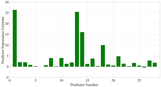 Some features will have more distinctive characteristics and, so, will provide more useful information. Hence, the initial feature set was investigated to determine the most important/useful features. Both the theory underlying what each feature was supposed to highlight and built in Matlab functions for estimating predictor (feature) importance were used to optimize the feature set. For this purpose, the Random Forest supervised machine learning approach was adopted as it is envisaged that its associated ensemble concept will be advantageous in identifying the correct received signal, as is shown in Section 4. Two Matlab functions were used with the Random Forest specifications applied, namely, TreeBagger and fitcensemble. Both functions were investigated using different numbers of trees with the full number of predictors available at each decision point. Hence, the model was trained using the available data and the out-of-bag predictor importance function was applied to each trained model. This was repeated for a number of iterations for each function and the final result combined the averages of the two individual approaches. The results of this feature importance investigation are supplied in Figure 8, where fourteen features were chosen, based on the results and the theory underlying the features, since, to be useful, the model will need to generalize to unseen data. The final feature set encompassed: (1) number of non-zeros entries of PDF (2) area in centre PDF bins (3) area in left PDF side (4) PDF centre bin value (5–7) the Hjorth parameters (activity, mobility and complexity) (8) the number of zero crossings (9,10) two entropy representations (11) absolute mean of samples (12) RMS value of samples (13) number of unique FFT thresholds, and (14) a unique FFT function that provides a differentiation between signals of different bandwidths. The final set of features is displayed in Table 3, where the initial feature number corresponds to Figure 8 and the final feature number corresponds to the input data, X, in the final models as developed in Section 4.