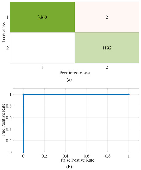 The aim of the binary classifier was to identify received samples as either being ZigBee or some other GHz ISM band signal. In essence, this is taking the WSN signal focused binary classifiers from the one-versus-all classification method. This approach would be suitable for potential applications of this methodology, which will be discussed later. The results of this binary classifier development are shown in Table 5, where four kernels were investigated using the “fitcsvm” function. The results focus on using all available testing data, including the additional “unseen” data, and datasets containing both 28 and 14 features were applied. Table 5 shows that the reduction in features enhanced the model’s performance, which reiterates the idea that only the most useful features were retained during feature optimization. The fourteen features did incur an increase in training time for specific kernels. However, in this study, prediction time is the more important as model training time can be carried out off-line. The associated prediction times for the reduced feature set did not increase and the model error was reduced, resulting in a positive outcome when applying the reduced feature set. The optimal kernel was chosen based on the achieved training and prediction times and model error, as per Table 5. The kernel that produced the highest performance was the third-order polynomial, which provided an area under the curve of approximately when using the 14 element feature set. This means the receiver operating characteristic (ROC) curve is near the optimum for a binary classifier. The confusion matrix and ROC for this kernel are provided in Figure 9a,b respectively, which shows that the errors were false positives. These results indicate that the SVM can identify ZigBee signals with a relatively low generalization error and, so, could be used to identify ZigBee signals in new environments. This is advantageous as the methodology discussed in this study could then be applied to multiple operating environments. The SVM performance will be compared to identifying the same ZigBee signals in the subsequent multi-class approaches.