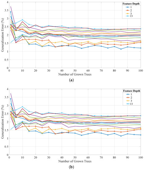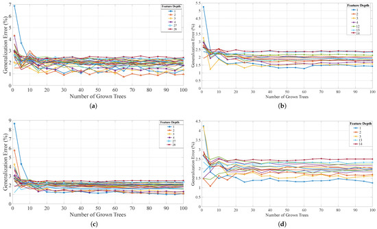 The generalization error results for the developed Random Forest approaches for a range of grown trees and feature depths (only certain depths marked as most follow a similar trend). (a) “TreeBagger” function and the original set of 28 features, where the error stabilizes between 1 and 2.15% as the number of trees increases. (b) “TreeBagger” function and the optimized set of 14 features, where the error stabilizes between 1.25 and 2.5% as the number of trees increases. (c) “fitcensemble” function and the original set of 28 features, where the error stabilizes between 1 and 2.1% as the number of trees increases. (d) “fitcensemble” function and the optimized set of 14 features, where the error stabilizes between 1.5 and 2.5% as the number of trees increases.