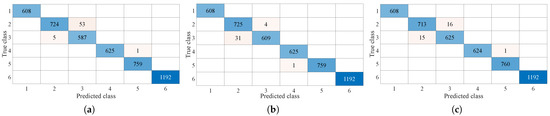 Confusion matrix for the (a) designed Matlab AdaBoostM2 method using sixty decision tree learners, a feature depth of seven, a minimum leaf size of three and a learning rate of 0.61992; (b) designed XGBoost method, which produced a generalization error of ; (c) designed DNN, which produced a generalization error of . The predictors are as follows: (1) noise (2) WiFi (3) router (4) Bluetooth advertising (5) CW and (6) ZigBee.