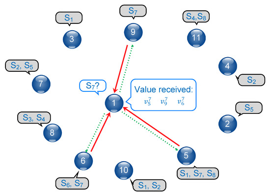 Figure 1 provides a simple example of a generic graph , with each node capable of providing one or more services, as highlighted in the grey clouds; is the node that is requesting the service , as highlighted in the white cloud; is the set of nodes that can provide the requested service. For each of the providers in , the requester receives a value for the service (red lines in the Figure), then aggregates them to compute the reference value . Based on this value, can rate the providers individually and assign to each of them feedback (dotted green lines in the Figure) that can be used to update their trustworthiness levels.