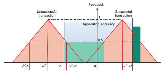 The requester is unable to assess the outcome of the transaction, so despite its result, it has to assign feedback to each of the providers. The maximum feedback is assigned to those providers that sent exactly the reference value , while the other providers receive lower feedback based on how much the provided value is distant from , as shown by the orange areas in Figure 2. Nodes that have provided values with a distance equal to the accuracy of the application, i.e., and , which represent the points of greatest uncertainty, are assigned feedback equal to 0.5. For intermediate values, the feedback follows a linear behavior, but other approaches are feasible and could also depend on the application at hand.