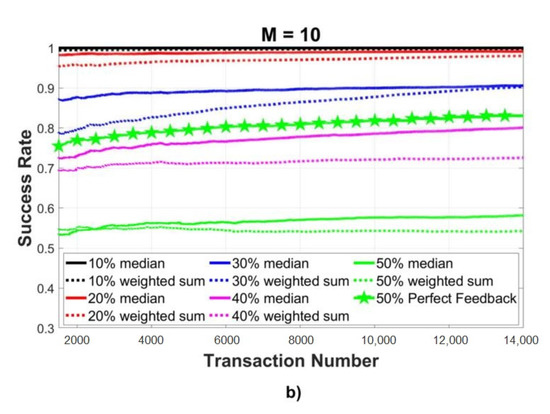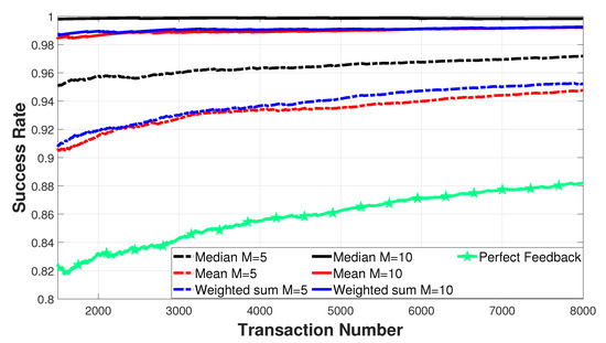 Surprisingly, the trust model that makes use of a perfect feedback evaluation has the lowest success rate out of all the versions: this is related to the number of providers M contacted by the requester. A requester with perfect feedback evaluation only interacts with one provider and thus they will need many transactions to accumulate enough experience to accurately evaluate the providers. In the approach proposed in this paper, multiple providers are required to infer the reference value and, even if each of them receives not perfect feedback, the overall learning process of the trust algorithm speeds up. Moreover, the presence of a higher number of providers enables increasing the success rate since it is difficult for few malicious nodes to change the reference value enough for the transaction to be considered malicious. The approach based on the median, dark lines in Figure is the most reliable since there must be malicious nodes in order for the transaction to be labeled as unsuccessful; using the mean is not ideal since a single malicious node providing a value very distant from the ground-truth value could significantly change the reference value. Finally, the weighted sum is able to obtain good results since it smooths out this effect by weighting every received value for the trustworthiness of the node that provided it.
