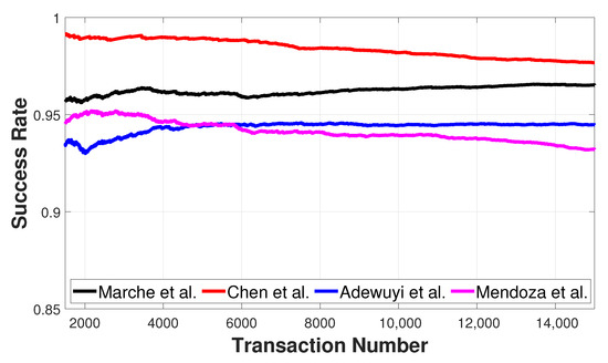 Figure 5 shows the comparison of the four trust models, considering a number of providers . We can notice that all the algorithms have a high success rate of over 90%, but Chen et al. and Mendoza et al. show an SR decreasing over time. This is due to the collusive attack that is able to confuse the network. The two mentioned algorithms have a short dynamic, i.e., that trust values of both benevolent and malicious nodes, and are concentrated around 0.5, so they are more prone to errors. Whenever there is a transaction where the collusive malicious attack is successful, the malicious nodes are able to obtain the highest value of feedback, since the reference value would correspond with the malicious value provided by all the nodes. So, even if really slowly, these nodes would impact more and more transactions, thus making the success rate decrease over time.