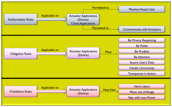 - Prohibition rules: The prohibition rules are defined for Devices (Actuator Apps) only where the smart internet-connected devices are prohibited from (i) actions that could harm users, e.g., getting too close to the user (respect personal space) while interacting with them, (ii) a device being in private locations (smoking rooms, rest room and so on), e.g., not to visit the private locations to assist or monitor the user, and (iii) a device continuing a task when its battery is below a set threshold, e.g., not to stay at a job if the power is low. Each prohibition is explained in more detail later in the paper.