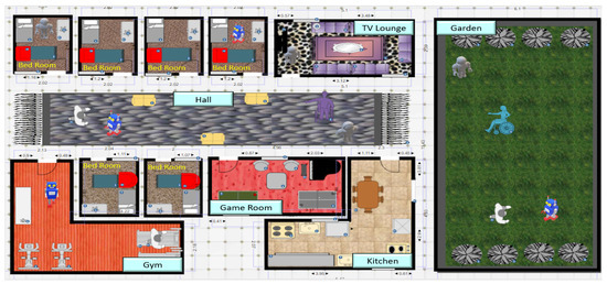 Figure 3 demonstrates the aged care scenario, where there are multiple seniors’ bed-rooms, a main hall, kitchen, gym, entertainment room, TV lounge, and the garden are shown with multiple smart robots. In the figure, a few seniors on wheelchairs are roaming around, and some staff members are moving in the hall. According to the scenario, it is presumed that the robots in an elderly-care center can be used to monitor different seniors through requests provided by their families (e.g., away from the aged-care center) using their mobile phones over a communicating medium, i.e., WiFi. Monitoring seniors in this case simply means sending the robot to the senior’s location and taking their photo or asking some questions. Similarly, staff members of the aged-care center through their mobile devices issue requests to a robot to assist them in their daily tasks. While performing these duties, the robots must adhere to the policy rules imposed by the aged care manager. The implementation of this scenario is explained in detail in the next subsections.