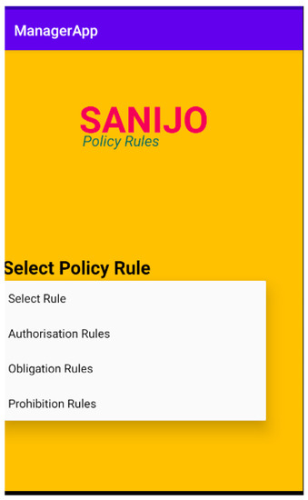 The policy rules are configured and selected via the central system app, an Android app in our prototype (refer to last subsection). Figure 5 and Figure 6 present the manager application (central app) interface which has the policy rules implemented in a drop-down menu to be selected by the manager. After selection of the policy rule, the next screen appears where the manager can select the smart device on which the previously selected policy he/she would like to impose exists.