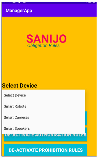 In this work, our implementation is on smart internet-connected robots to demonstrate the applicability of the SANIJO framework and SANIJO language. Scanning the policy language and then following all applied policies by the smart robot while interacting with seniors or staff members in an aged-care center is beneficial because in this way, the smart devices can interact ethically with the users and make them feel comfortable—and what behaviors are abstracted via the rules in SANIJO. The background work (Section 2) highlighted the literature where it is clear that researchers have focused on human–device interaction but have not focused on how a device must behave with humans during human–device interactions.