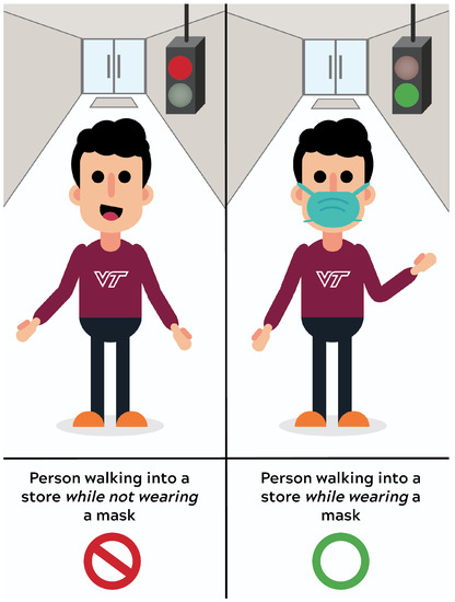 A widespread problem since the inception of the pandemic has been not just the virus itself, but its airborne spread, which is believed to be directly correlated with mask usage [5]. One particular challenge in the present environment is that of mask adherence, which has largely been delegated to ‘gatekeeper’ store employees that can themselves get sick and/or lead to altercations when prompting incoming patrons to don their masks [6,7,8]. Industry is increasingly adopting Internet of Things (IoT) devices that incorporate machine learning for various applications [9]. It is clear that an IoT device presents an ideal solution for helping society adapt to the challenges presented by the pandemic. Therefore, we want to test the feasibility of a more automated machine-based solution that is capable of giving a binary decision as to whether individuals are wearing masks, which may be converted to a visual green/red light that indicates permission to enter; a notional example of this process is depicted in Figure 1. For maximum marketability and deployment versatility, the solution is designed to be capable of processing collected data without requiring cloud or other third-party computing services to ensure that inference decisions are relayed to users reliably and immediately. Our solution lays the initial foundation and identifies the challenges of what we envision will be a fully-automatic ‘mask compliance’ assessment IoT device that can record, analyze, upload, and communicate data to other entities such as epidemiologists, state health departments, human resources personnel, or consumer marketing researchers.