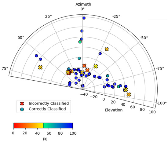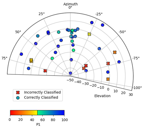 To estimate the performance of the CNNs in situations where faces appeared off axis, a controlled experiment was devised to evaluate images of an individual (a) wearing a mask and (b) not wearing a mask while moving their head pose across different azimuth and elevation angles. The img2pose PyTorch package for facial detection and alignment was used to obtain the angles [44]. Figure 3 and Figure 4 display the side-to-side and up-down angles of the head pose, plotted by performance from the frame of reference of the camera. A coordinate of 0 azimuth and 0 elevation corresponds to an individual facing the camera along its boresight without moving their head to the left, right, up, or down. A coordinate of negative elevation means the individual was looking upwards. A coordinate of negative azimuth means the individual was looking to their left. Each point in Figure 3 and Figure 4 represents a recorded image in terms of head pose orientation and the output probability score of the correct label being assigned—i.e., ‘mask’ or ‘no mask’. The performance of the augmented MobileNetv2 model was 78.57% and 84.50% for the ‘no mask’ and ‘mask’ image sets consisting of 42 and 71 images, respectively.