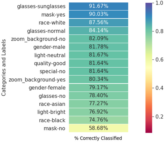 Quantitatively describing the quality of an image is a more complex task than it initially seemed; in fact, the overall existence and nature of a ‘quality measure’ has come into question. These questions, partially asked and answered in [50], have straightforward solutions; a good quality metric for facial images separates images that improve recognition performance from those that impair recognition performance. The ‘meaning of existence of the quality metric’ remains vague in the scope of this paper, given that we are evaluating mask presence rather than generic facial characteristics, but is a subject of investigation for future work. A rank-order comparison of the underlying parameter labels, and their corresponding differences when only qualitatively-assessed ‘high’-quality images are retained, are shown in Figure 8 and Figure 9.