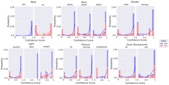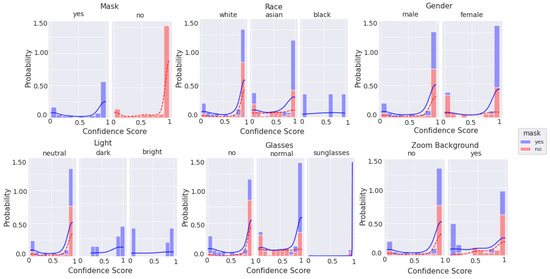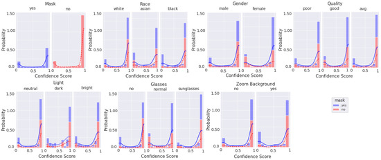 Box plots are a useful way to illustrate basic statistics in a set of data, thus simplifying the identification of relationships and distributions that may lie within the data [60]. The upper and lower extrema are represented by the top and bottom lines, respectively; similarly, the upper and lower quartiles are represented by the top and bottom of the box. The median of the data is represented by the center line. For this application, box plots help visualize how each category and label are related to the confidence score output (described below) by the model during classification. Figure A1–Figure A4 consist of box plots displaying the categorical label distributions for ‘mask’ and ‘no mask’ images. On the vertical axes, confidence scale refers to the outputs from the model for the correct classification label: during evaluation, a softmax function is used to scale the two model outputs between 0 and 1 so that the sum is 1. corresponds to the ‘mask’ label and corresponds to the ‘no mask’ label. For instance, an image of an individual wearing a mask with output confidence scores would be a correctly classified ‘mask’ sample with 72.9% confidence. If the confidence value for the correct label is less than 0.5, the image was labeled incorrectly by the neural network. The horizontal axis for each plot lists the categorical label names. For each of these labels, the boxes are plotted directly alongside each other for ‘mask’ and ‘no mask’ cases. For example, referring to Figure A3, the ‘glasses’ category can be ‘no’, ‘normal’, or ‘sunglasses’ for each variation of glasses-wearing individual. Furthermore, there are relatively few examples of individuals wearing sunglasses, compared to individuals wearing normal eyeglasses or no glasses at all. Images with an individual wearing normal glasses and no mask had a lower typical confidence score than images with an individual wearing normal glasses and a mask.