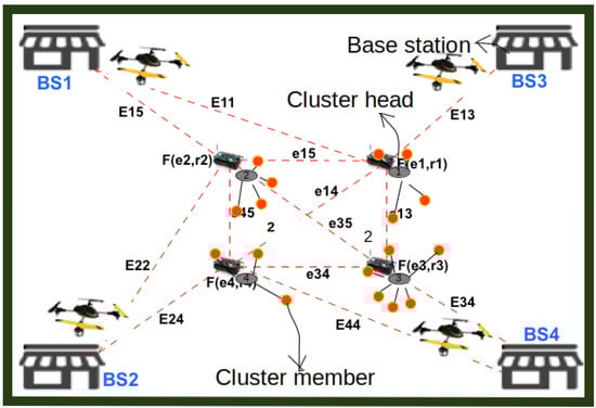 The cooperative data muling model considered in this paper is illustrated by Figure 1. The figure reveals four base stations (B1, B2, B3 and B4) from where UAVs take off to collect data from sinks located in a region of interest and later comes back for data delivery. In this illustrative scenario, all possible collection paths that can be taken by each UAV from the base stations to access data collected by cluster heads (1, 2, 3, and 4) and deliver the collected data to the closest base stations, are represented in dotted and orange lines, whereas the continuous black lines show the communication links from sensors to their cluster heads. Here, we assume that UAVs are assisted by special nodes (cluster heads/sinks) to collect information to reduce the loss due to the UAVs capabilities (fuelling, timing, etc.). Furthermore, it is assumed that the UAV paths topology is known (this means that all possible communication paths between all sensors are known) and it is represented by small black lines in the figure. The total energy required for data collection at a node/sensor, say i, is a function of its revisit deadline (the maximum amount of time required to (re)visit the node) and the energy required to transfer data from node i to an arriving UAV. The travel cost from a base station to a sink i is translated in an energy metric denoted by , and the transportation cost between two sinks i and k is also translated into an energy metric denoted by .