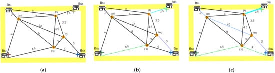 Figure 2a shows the initial conditions of the considered system. The system has four sensors, four base stations, and three UAVs positioned at all of them except for Base station Bs1. The links and sensors are weighted as discussed in Section 2. Let u2, u3, and u4 be the name of the UAVs staying at Base Stations Bs2, Bs3, and Bs4, respectively.